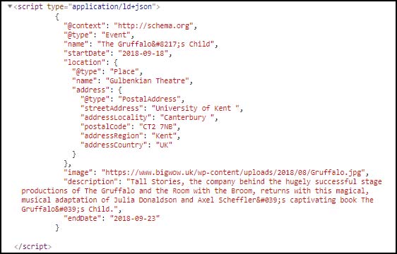 The structured data we are interested in sits in the code for your website and looks similar to the below. It is important to note that the information you are outputting in the structured data should be featured on the page for standard users to view, otherwise Google won’t feature it in the results. There are different formats for this content but this is simply an example:
